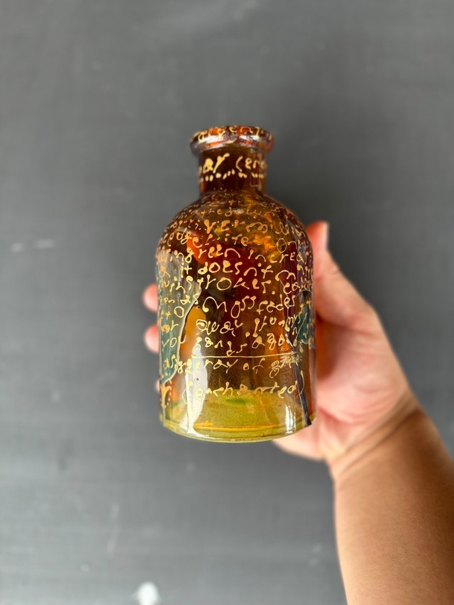 アンティーク風のガラスボトルに作家が絵付けしました。そのまま飾っても、好みの草花を活けても、、、世界に一つの彩りが、やさしい豊かさと光を運んでくれます。 PURODUCT DETAILS Size:高さ110mm(持ち手含む長さ185mm)・底Φ50mm・口径28㎜ Material :ガラス