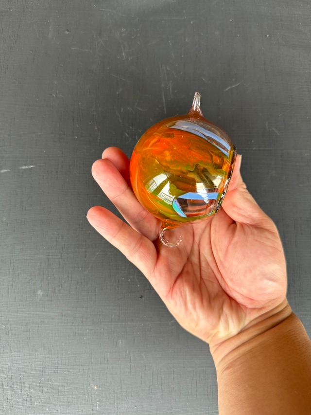 アンティーク風のガラスの飾りに作家が絵付けしました。そのまま置いて飾っても、ひもを通して飾っても、、、世界に一つの彩りが、やさしい豊かさと光を運んでくれます。 PURODUCT DETAILS Size:高さ110mm・75mm×80mm Material :ガラス